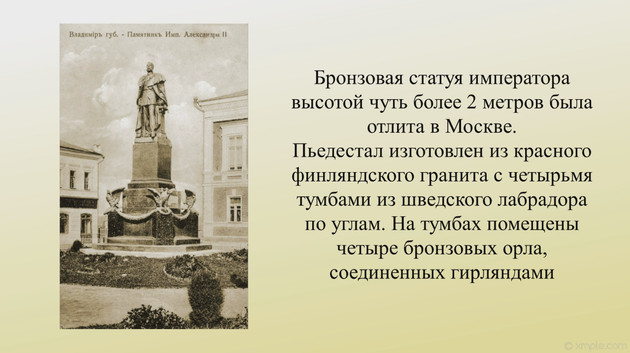 Одной из самых внушительных примет празднования 50-летия отмены крепостного права стали памятники Александру II по всей стране, в том числе и во Владимирской губернии.
