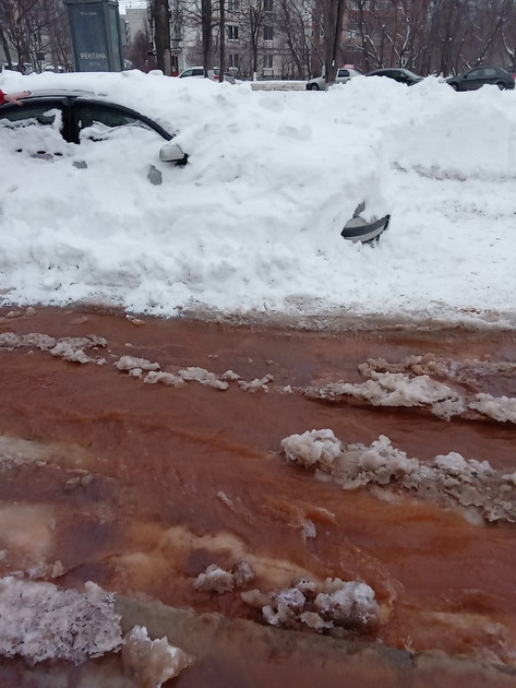 В областном центре из-за морозов случилась очередная коммунальная авария. Фото и видео, как по улице Горького разливается ржавая вода, разместили очевидцы в соцсети ВКонтакте, в паблике «Подслушано во Владимире».