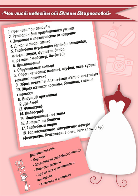 Определившись с форматом, вы сможете понять, какие именно свадебные «атрибуты» необходимы, а от каких можно смело отказаться. Конечно, есть необходимый минимум классического торжества: сама церемония, ресторан, обручальные кольца, образы невесты и жениха, фотограф и ведущий. Но сегодня в свадебных списках новобрачных возникают и другие пункты: декораторы, флористы, видеографы, кондитеры, приглашённые артисты. Помните, что свадебный чек-лист гибкий, а вот итоговая сумма – нет. Поэтому конструировать свадьбу стоит исходя именно из вашего бюджета.