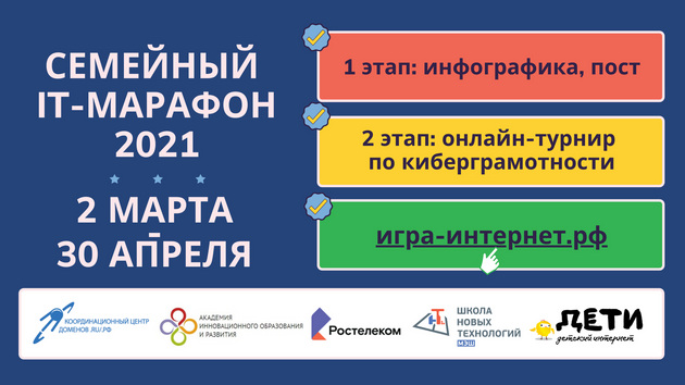 - Творческое задание — со 2 марта по 20 апреля. Участникам предстоит опубликовать пост о проведении ИТ-марафона в социальных сетях или подготовить инфографику по материалам образовательных игр проекта «Изучи интернет — управляй им».