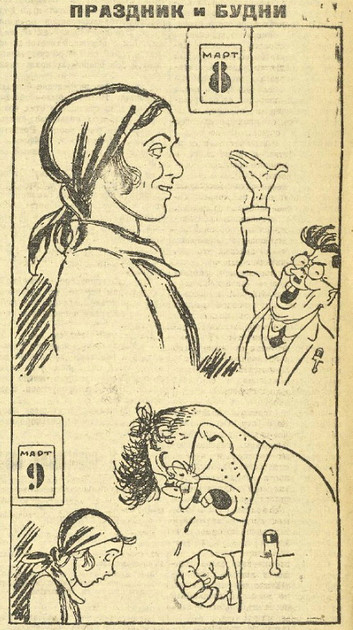Трудно даже сегодня представить, чтобы на 8 марта пресса обсуждала проблемы безработицы, проституции или опасности частых абортов. А в 1920-е годы сложных тем на женский праздник местная пресса не скрывала: «НЭП создал женскую безработицу, вызвал проституцию. Государство, не имея доходов, не могло за свой счет содержать яслей для детей работниц, столовых и других учреждений. Они стали сокращаться. Дети снова обсели работницу, а тут она еще лишается работы. Спасая жизнь свою и своих детей, работница возвращается к нелюбимому мужу, или находит нового, - не потому, что его любит, а потому, что жить стало нечем. Бывает хуже – идет в проститутки, только бы обеспечить сегодняшний день куском хлеба. Какие тут пути освобождения, - только бы жизнь спасти!» («Призыв», 8 марта 1923 года).
