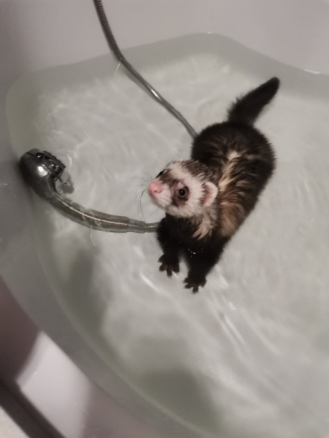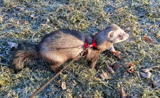 Вообще Шнур — хорек-парадокс. Гулять не любит (как надевать шлейку — так истерика с извиваниями, а на улице стремится быстрее забраться на ручки), но от снега млеет. Так что зимой ему приносят снег в тазике — он там роется, закапывает игрушки. Настолько любит снег, что на лето для него придумали альтернативу — насыпают в тазик винные пробки, где он и копается.