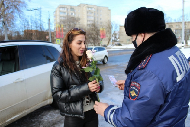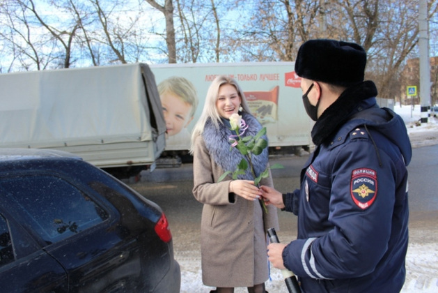 В преддверии 8 Марта и в сам праздник УМВД России по Владимирской области традиционно провели акцию «Цветочный патруль». В ее ходе сотрудники ведомства поздравляли автолюбительниц: дарили им цветы и открытки.