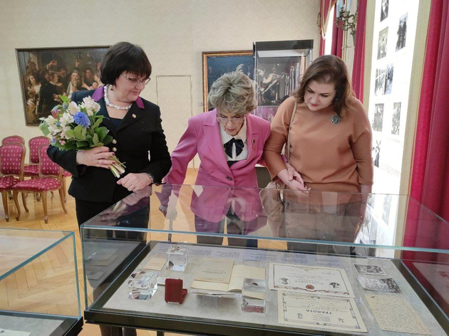 Также юбилярша оценила и экспозицию, посвященную ее личности и судьбе. В дворцовом зале Палат представлены награды и личные вещи Алисы Аксеновой. Также в рамках выставки можно прочесть об основных вехах в судьбе именинницы.