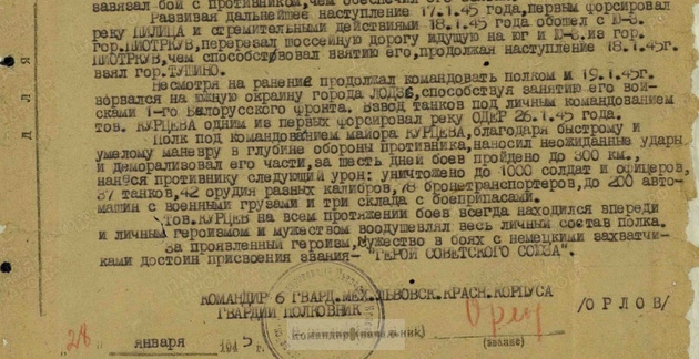 В принципе, не раз в этой операции полк под командованием майора Курцева в глубине обороны противника наносил неожиданные удары и деморализовал его части, уничтожив до 1000 солдат и офицеров противника, 37 танков, 42 орудия, 78 бронетранспортёров, до 200 автомашин противника с военными грузами и три склада с боеприпасами. И, кстати, наш земляк, всегда был впереди и «личным героизмом и мужеством воодушевлял весь личный состав». Звание Героя Борису Курцеву присвоили 10 апреля 1945 года.