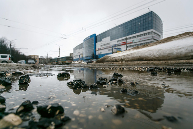 У рынка «Восток» асфальт малыми и большими кусками сходит вместе со снегом.