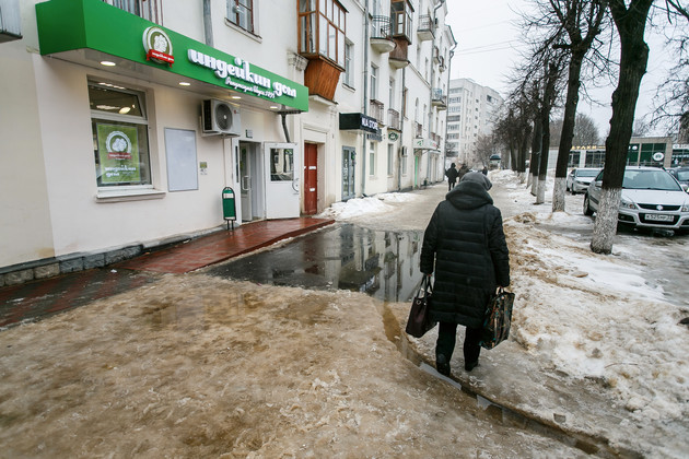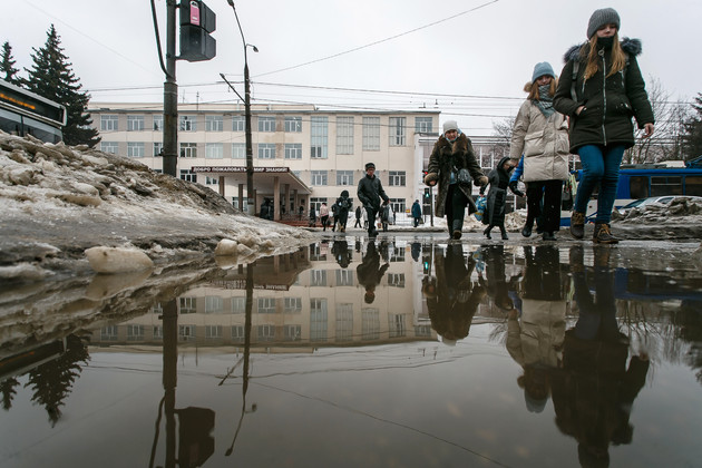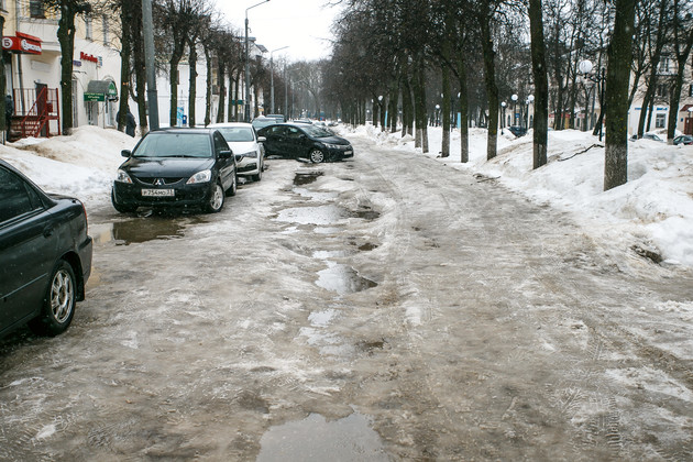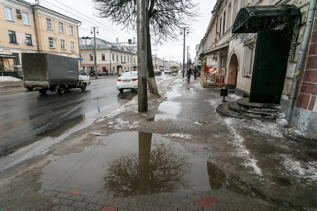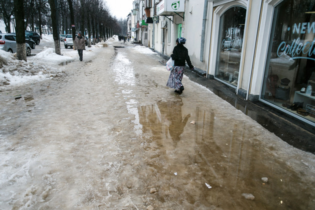Повсеместно и везде на улицах Владимира — оседающие на глазах горы снега, из-под которых разливаются лужи.