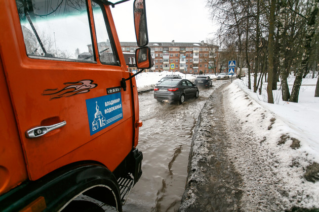 Ливневая канализация на этом участке так и не появилась, хотя каждую весну жители наблюдают тут одну и ту же картину: улица, лужа, цистерна. Мэрия областного центра тем временем рапортует: МУП «Владимирводоканал» обслуживает около 150 км сетей ливневой канализации, и все эти сети проходят обязательную ежегодную проверку.