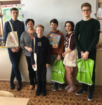 В этот раз все знатоки игры «Учим немецкий, играя» по традиции получили приятные подарки, которые предоставил культурный центр им. Гёте. Это книги, аудиокассеты, журналы, сумки, открытки, игры. Победителями в это раз стали ученики Ирины Смирновой: пятиклассник Матвей Королёв и девятиклассник Глеб Ислентьев.