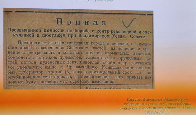 Еще никто до Андрея Борисовича Соловьева так подробно не изучал по документам самое начало ЧК во Владимирской губернии. Это уже позже ЧК стала централизованной, вертикальной структурой. А поначалу Чрезвычайные комиссии по борьбе с контрреволюцией и саботажем создавались по отдельности при уездных и губернских Советах, на их скудные бюджетные средства.