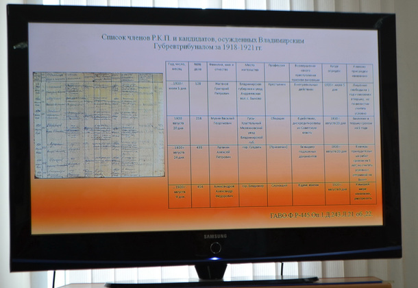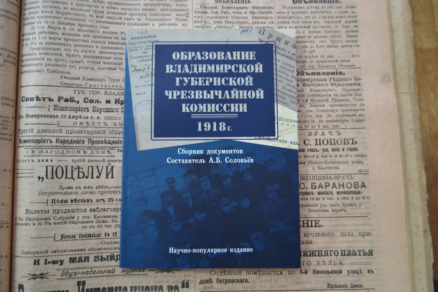 Что в этих фондах может отыскать упорный исследователь? Яркий пример результативного поиска - новая книга, презентация которой стала главным событием дня на проекте «Хвала Клио». Сборник документов «Образование Владимирской губернской чрезвычайной комиссии. 1918 г.» подготовил и опубликовал по итогам трех лет архивных изысканий руководитель музейного образования «Музей истории органов безопасности во Владимирской области», кандидат политических наук Андрей Соловьев.