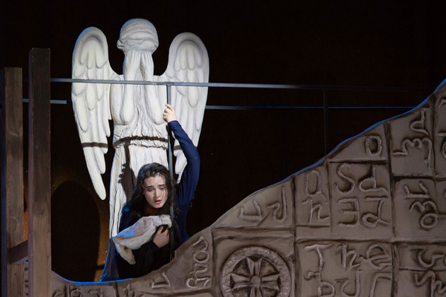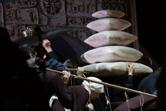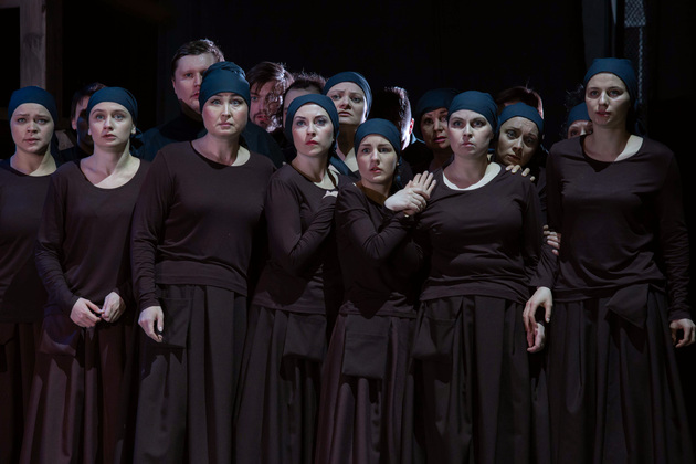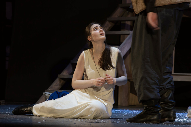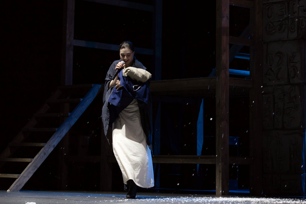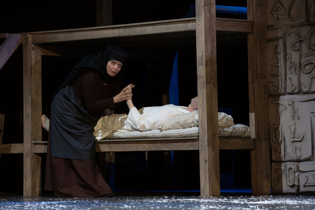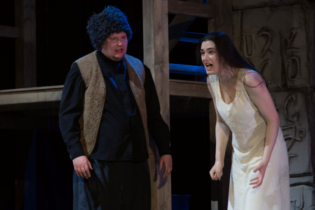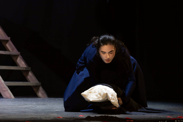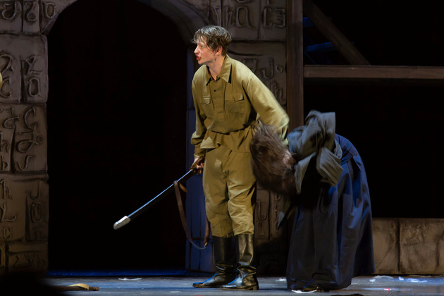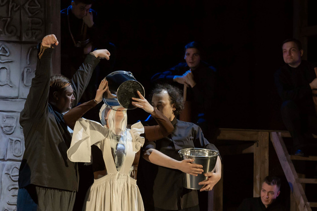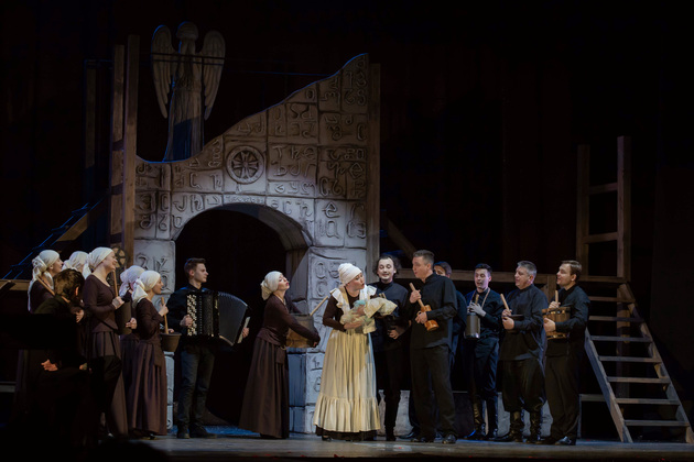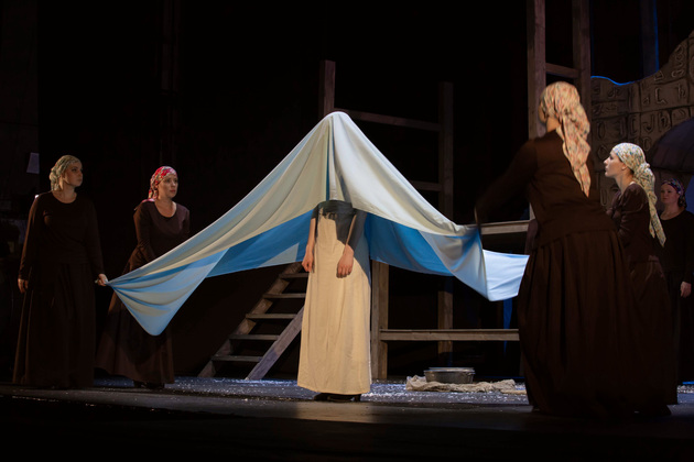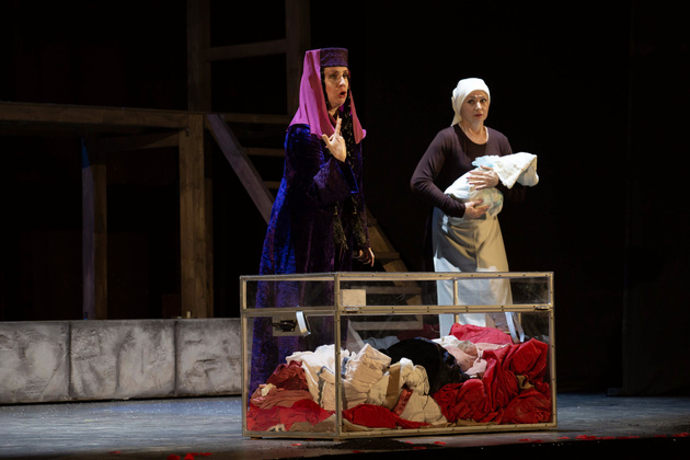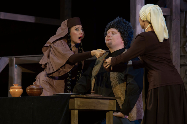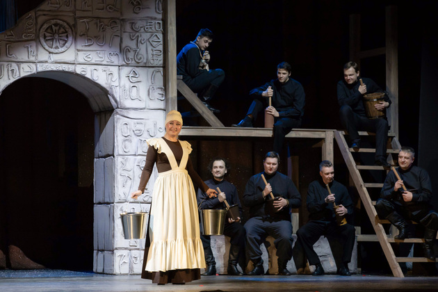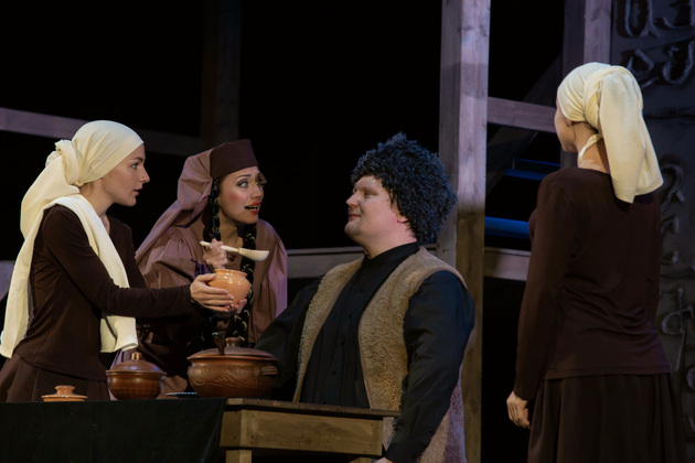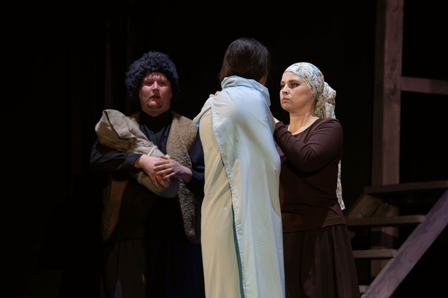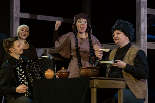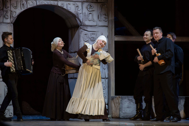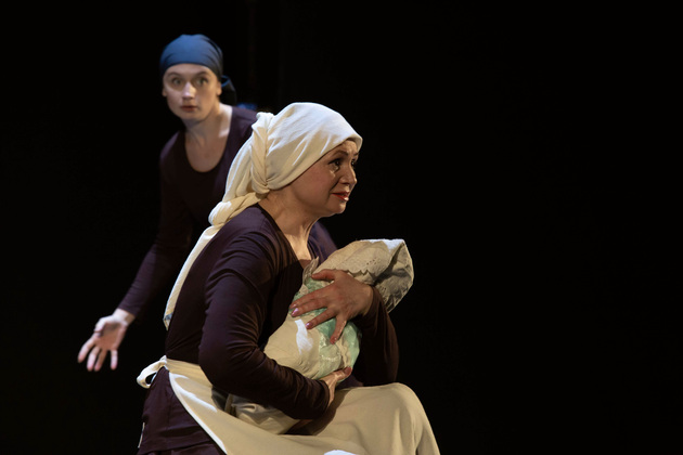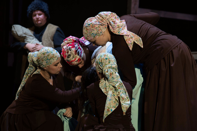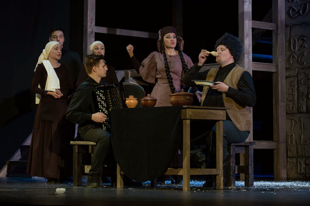 История Брехта, которая в «буквенном» изложении выглядит слезливой драмой, у Зайкаускаса местами вышла мюзиклом, местами - трагифарсом, а местами — комичной мелодрамой. Но знаете — такой подход работает! Даже удивляясь, ты хочешь продолжать смотреть, как комичный самодовольный губернатор-рогоносец в феодальной Грузии теряет пост и жизнь в результате бунта князей, как его жена Нателла убегает с адъютантом мужа, бросив новорожденного младенца, а худенькая посудомойка Груше, невзирая на риски и трудности беспорядков, берет малыша на свое попечение — и вместе с крохотным кульком, который вечно хочет кушать и портит пеленки, отчаянно убегает от преследующих их солдат. Бедная девочка, живущая мечтой о встрече с любимым (который где-то еще служит) скитается по горам, не находя поддержки, голодает и мерзнет, рискует свалиться в пропасть, но - не бросает чужого кроху. В итоге добирается до дома брата — трусливого подкаблучника, чья жена Анико (в забавном исполнении Анны Лузгиной) совсем не рада изможденной гостье. Братец под напором своей половины сплавляет девушку замуж — якобы фиктивно, якобы за умирающего, по сговору с его матерью-крестьянкой, мечтавшей о бесплатной рабочей силе в доме и женщине для непутевого сына-грубияна, который, как сейчас говорят, под видом болезни «косил» от армии. Так что ад для девушки продолжался... Ну а когда междоусобица закончилась, вернулись и жених Груше, и Нателла (эксцентричная роль Галины Фатхутдиновой). Первый был так обескуражен ситуацией с замужней невестой, что повел себя ограниченно благородно, а вторая выразила готовность биться за ребенка, наследника губернаторского имения, с нищей посудомойкой. Судить их довелось Аздаку, бывшему деревенскому писарю, который весело и азартно берет взятки у богачей (пачками, портфелями!), но решения потом выносит такие, что богачам потом - хоть стой, хоть падай... Кстати, у исполнителя этой роли - Георгия Девятисильного получился один из самых ярких образов в спектакле. Актер, что называется, «жёг». Именно его персонаж разыграл ключевую сцену — суда по опеке над младенцем, в основе которой — притча о царе Соломоне, решавшем, кому из двух матерей отдать ребенка, и не стандартно определившем, кто из женщин — его настоящая мама. В спектакле владимирского театра он одним хэппи-эндом не ограничился.