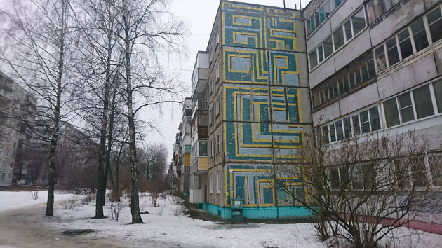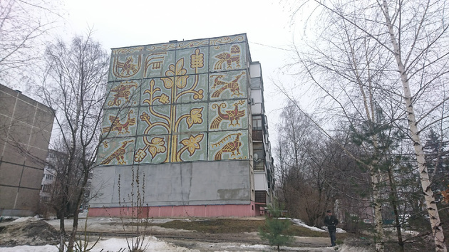 Есть и такие панно, которые уничтожили частично. Осенью 2020 года на улицах Юбилейной и Ноябрьской детали мозаики скрыли утеплителем. А на проспекте Строителей мозаику не видно из-за неудачно пристроенного в советские времена дома.