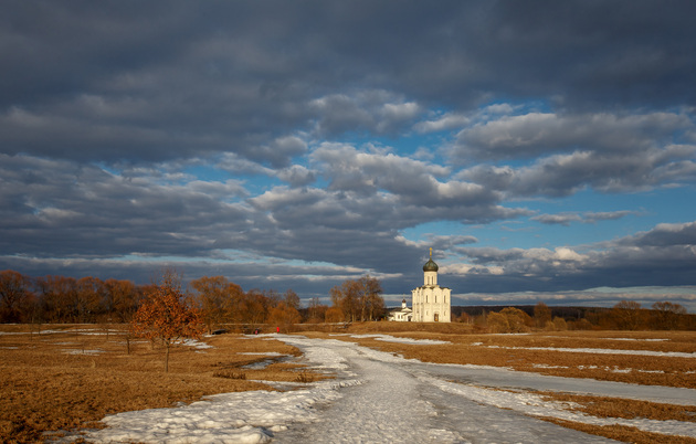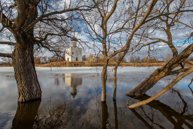 Все стремятся запечатлеть храм в разное время года и дня. В первые теплые апрельские дни на Боголюбовский луг начала поступать вода из вскрывшейся ото льда Нерли и ее притоков.
