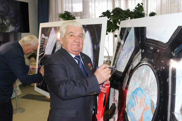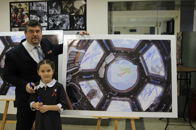 Космонавты поставили на фотоработах свои памятные автографы с добрыми пожеланиями призёрам конкурса, а также подготовили сувениры со своими автографами для вручения юным авторам рисунков.