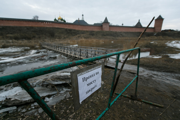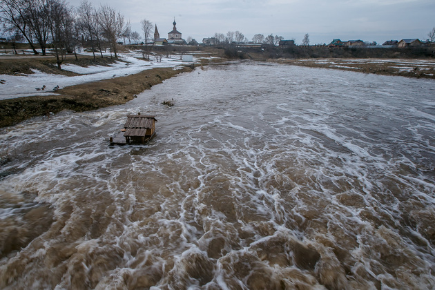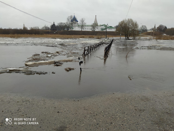 В Суздале после обильных ночных осадков уже в третий раз затопило пешеходные мосты. На этот раз - четыре. Близ Спасо-Евфимиева монастыря на улице Покровской, близ Васильевского монастыря, поврежден мост близ Музея деревянного зодчества. Еще вечером 7 апреля здесь можно было пройти пешком.