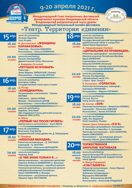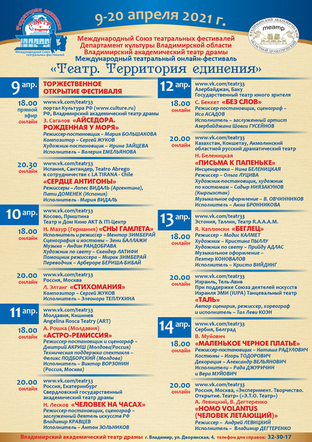 С 9 по 20 апреля Владимирский академический театр драмы проводит международный онлайн-фестиваль. Все эти дни на его страничке ВКонтакте (https://vk.com/teatr33) в 18.00 и в 20.00 (в одном случае в 20.30) будут идти прямые трансляции спектаклей театров-участников.