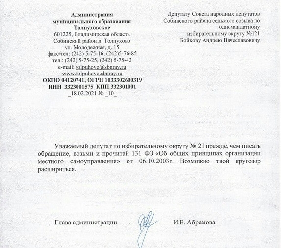 Напомним, в феврале текущего года депутат СНД Собинского района Андрей Бойков на своей странице в социальной сети Вконтакте опубликовал официальный ответ главы Толпуховского муниципального образования на депутатский запрос о сроках исправления недоработок по ремонту подвала многоквартирного дома. В документе чиновница вместо того, чтобы ответить по существу, посоветовала народному избраннику “расширять кругозор”. При этом в самом тексте за подписью главы администрации сельского поселения содержалось множество ошибок.