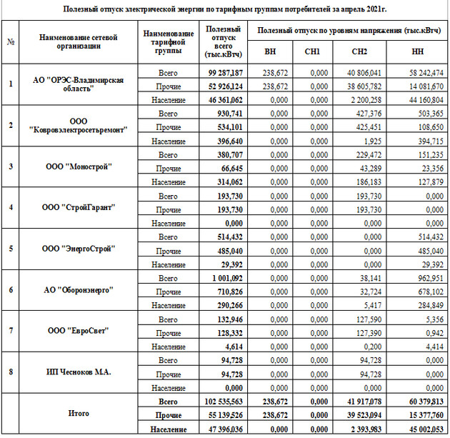 Компания АО «Владимирские коммунальные системы» опубликовала информацию об объеме фактического полезного отпуска электроэнергии. Сведения даны в разрезе сетевых компаний по уровням напряжения за апрель 2021 года.