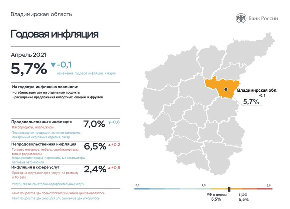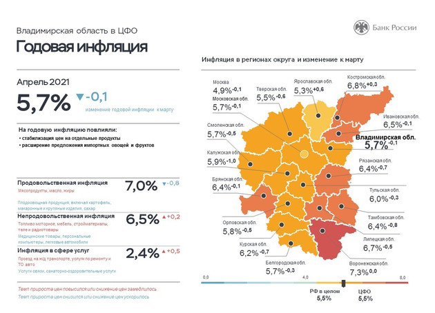 5,7% - это лучше, чем в большинстве регионов ЦФО (см. инфографику). Если конкретно, то «замедлился рост на яблоки, груши, апельсины, крупы, хлеб, макароны». По крупам сказался «сдержанный спрос» - в отличие от ажиотажных закупок годом ранее, а по хлебу и макаронам — сыграли роль субсидии мукомолам и хлебопекам.