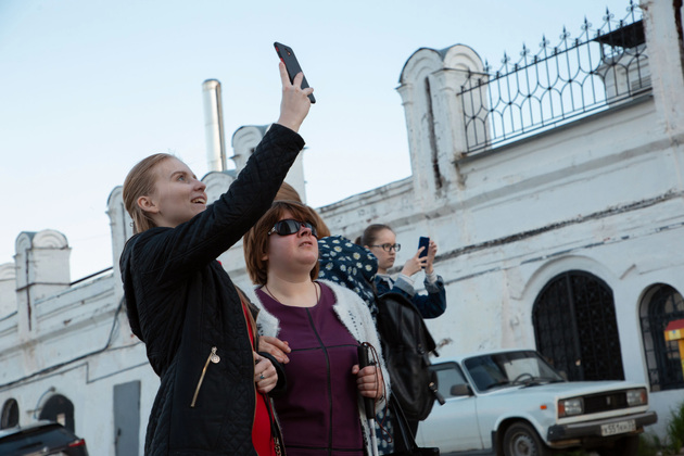 К Рождественскому монастырю за экскурсоводом уже шли около 80 человек. Некоторые специально приехали даже из других городов. Как подруги Наталья Безруковоа и Татьяна Соловьева из Гусь-Хрустального. Девушки – настоящий пример позитивного отношения к жизни и открытости новым впечатлениям. Но вообще среди экскурсантов – люди разного возраста. Ученик 4-го класса Тимофей Панкратов на экскурсию пришел с родителями, но держится поближе к экскурсоводу.