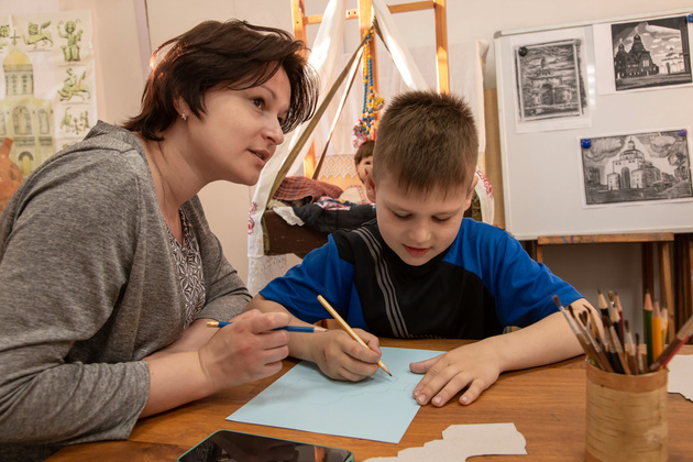 - Сюда мама привела, я сначала сам не хотел идти, а сейчас нравится. И рисовать нравится, и то, что объясняют, что мы рисуем. Вот это барабан. На нем купол, - показывает Захар.