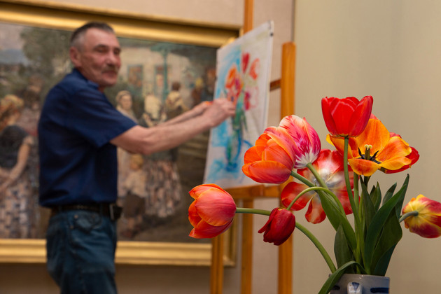 На мастер-классе Заслуженного художника РФ Владимира Севостьянова участники рисовали пастелью букет тюльпанов. В зале особая атмосфера – добрая, творческая. Ни капли рутинности.
