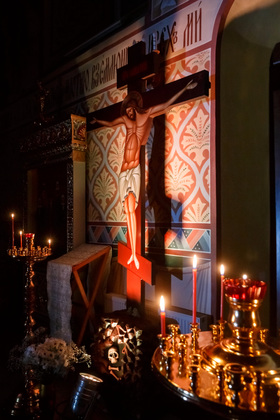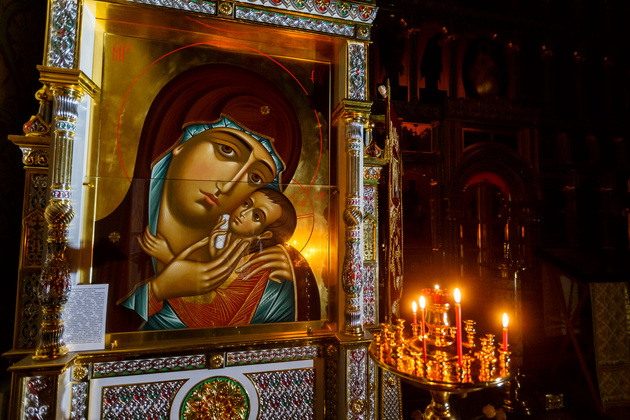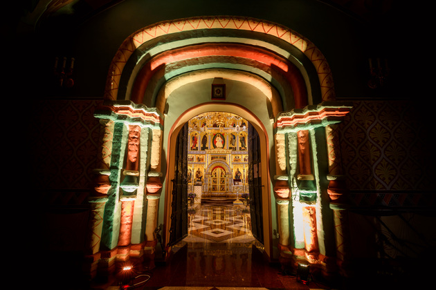 Смысл тут в том, что в начале люди видят абсолютно темный храм, в середине которого стоит большая свеча. Для каждого она символизирует что-то своё, что-то теплое и вечное. Свеча пронизывает всю нашу программу. Между песнопениями у нас есть небольшие перерывы, когда зрители могут посмотреть на эту свечу. Она возвращает их высокодуховное и сконцентрированное состояние. Что же касается другой подсветки, то люди никогда не могут знать наверняка, какая часть храма будет подсвечена в следующую секунду. Потому что подсвечиваются все фрески и иконы. То есть мы достигли такого эффекта, когда зритель никогда не знает, что будет дальше. В этом заключается глубокая, духовная драматургия программы.