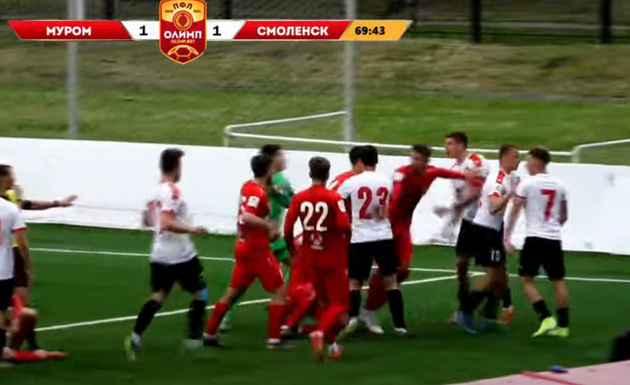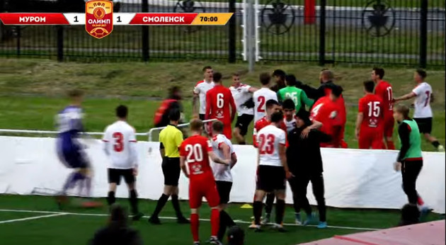 Во время атаки «Смоленска» один игрок зацепил другого за ногу, ничего особенного. Но футболисты двух команд по этом поводу тут же сцепились не на шутку, и запахло дракой. В нарастающую потасовку вмешался и вратарь «Мурома» Артем Романов. Похоже, он пытался разнять ссорившихся коллег. Но тут же получил сильнейший удар в лицо, да такой, что даже упал. Муромские игроки, как и следовало, ожидать, бросились защищать своего голкипера. Но тут вмешались и судьи, и даже тренеры. Толкающаяся группа футболистов переместилась за пределы поля. И постепенно страсти улеглись.