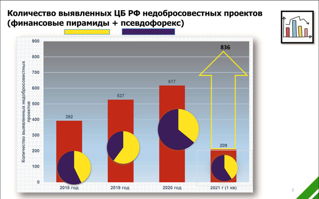 Для сравнения — за весь прошлый год пирамид в стране нашли 222 штуки. У многих — обширные филиальные сети. Если темпы «прироста» не упадут, то итоговая цифра по 2021 году получится просто пугающей — 340 пирамид. То есть практически каждый день все мы будем находиться «под прицелом» мошенников такого рода.