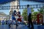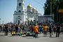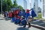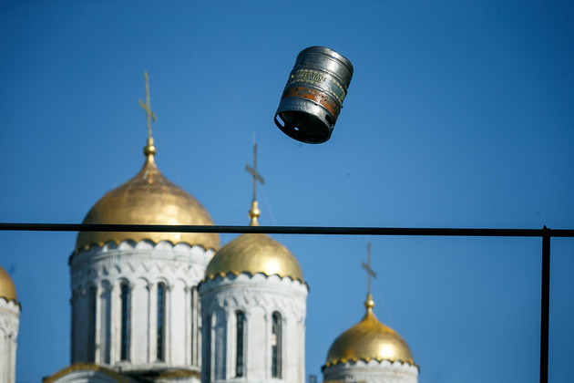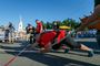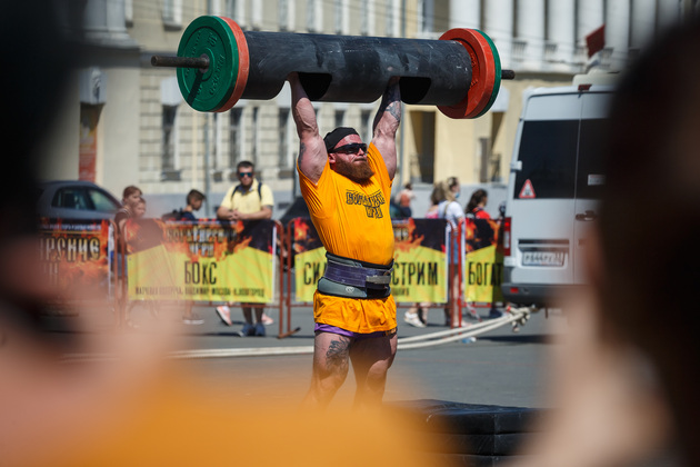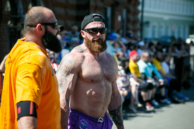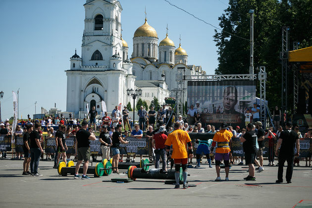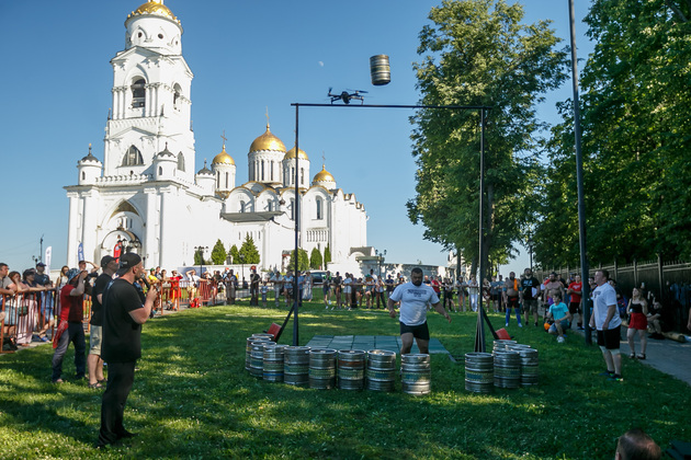 «Богатырские игры» в этом году были юбилейными, пятыми по счету. В 2017 и 2018 гг. они проходили на спортивных стадионах, а затем переехали на Соборную площадь. В прошлом году из-за пандемии состязания состоялись в сентябре, в осенней прохладе. В этом экстрима и так необычным состязаниям силачей придавала 30-градусная жара.