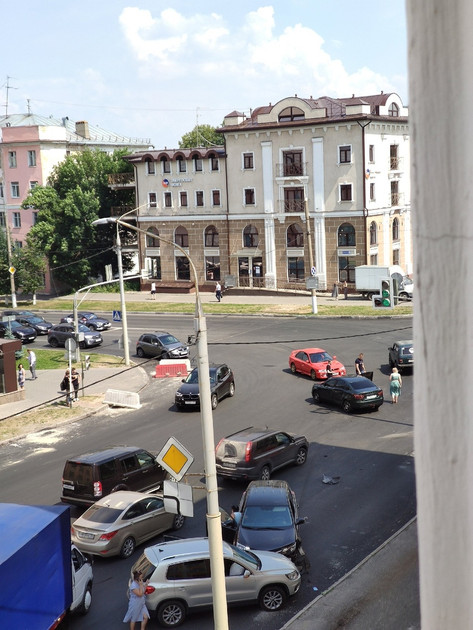 До сих пор на одной из центральных улиц города водопроводные люки закрыты ограждениями. Разные участки проезжей части сужены в хаотичном порядке - в зависимости от местоположению люка. Похоже, водители маневрировали, маневрировали и не удержали дистанцию, столкнулись.
