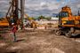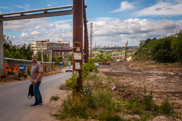 Ринат Шаниязов начал информирование журналистов о дорожной стройке на участке в нескольких сотнях метров от улицы Погодина. Здесь идет, кроме прочих работ, бурение под сваи.