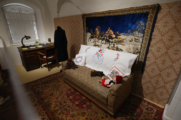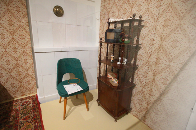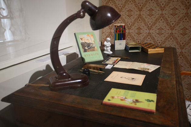 А вот послевоенный период: детская комната 50-60х годов прошлого века. Над диванчиком с покрывалом и подушками, вышитыми гладью, – плюшевый ковер с изображением тройки, рабочий стол школьницы, ее учебники, этажерка с рукоделием.