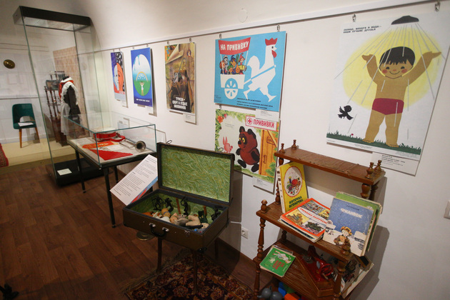 Есть в экспозиции и весьма актуальный плакат 1972 года о необходимости прививок: белый петушок везет тележку с со сказочными героями, которые держат транспарант «На прививку». Внизу плаката – обращение к взрослым, чтобы своевременными прививками уберегли своих детей от дифтерии, кори, коклюшем и других инфекционных заболеваний.