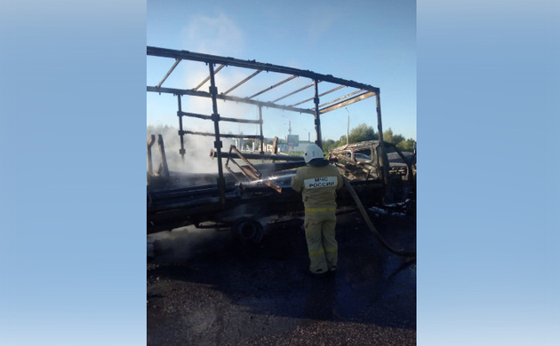 Сообщение о возгорании грузового автомобиля на трассе М-7 в д. Новая Быковка поступило в Главное управление МЧС России по Владимирской области 5 июля в пять утра. Пожарно-спасательные подразделения оперативно выехали на место. На момент прибытия фура была объята огнем по всей площади.