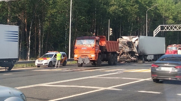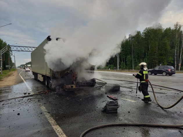 19 июля около 5 утра на трассе М-7 во Владимирской области столкнулись два большегруза "МАЗ" и "Вольво". Водитель "МАЗа" врезался в стоящий на светофоре "Вольво", после чего кабина загорелась. На месте аварии работали сотрудники МЧС России по Владимирской области, «скорая» и ГИБДД.