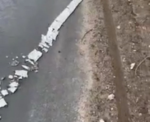 На кадрах горожанин поднимает с земли полосу, нанесенную разметочной краской. Она падает и разбивается на куски.