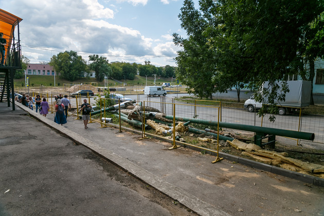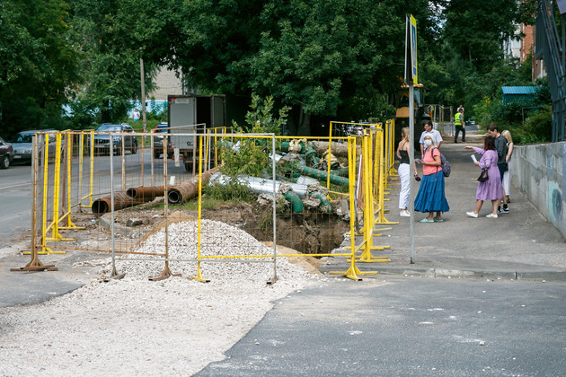 На проспекте Строителей, в месте его пересечения с Белоконской, трубы теплотрассы уже убраны под землю. Асфальтовое покрытие восстановлено. Осталось только провести отсыпку газонов.