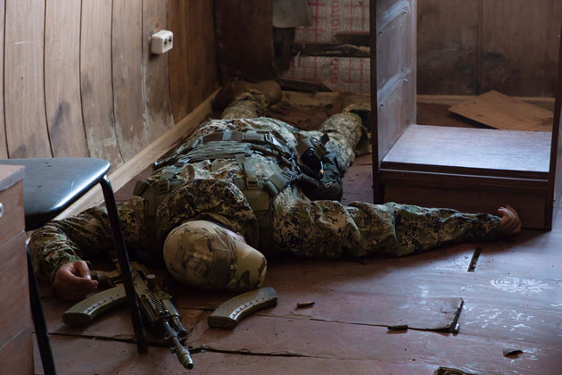 Никаких показательно-постановочных повторов специально для СМИ не было, что мы на самом деле любим — снимать не постановки, а как спецназ реально работает. Единственное, уже потом, когда активная часть закончилась, мы все таки попросили «террористов» красиво изобразить ликвидированных, что ребята, смеясь, по-дружески и сделали.