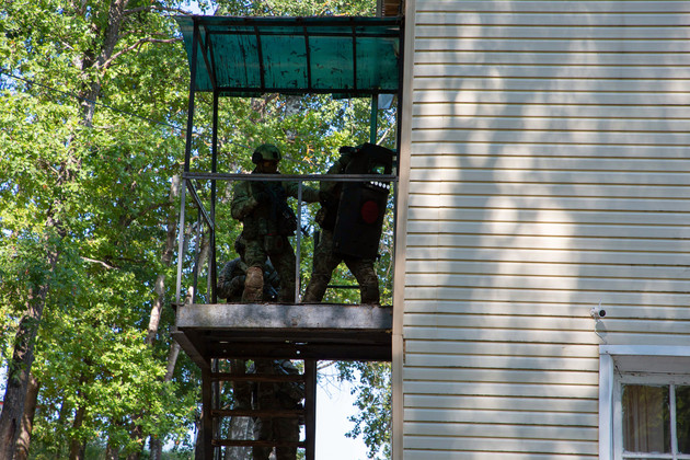 Все произошло очень быстро: сигнал к штурму, после чего с одной стороны к зданию подкатила машина, которая стрельбой и взрывами отвлекла на себя внимание «террористов», а с другой — вперед пошла штурмовая группа под прикрытием щитового. Двери и окна не вышибали, но шли слаженно, стреляли прицельно и задачу выполнили. Лично нам показалось, что в активной фазе операции - от начала и до конца штурма прошло не больше трех минут.