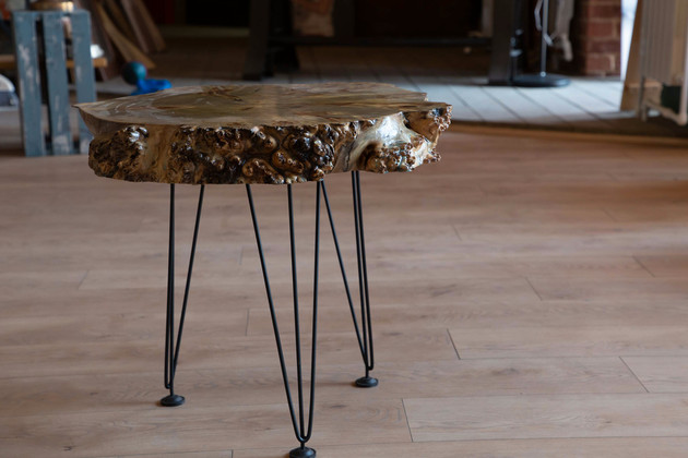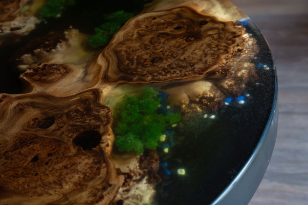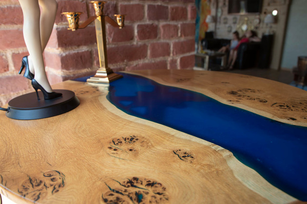 В выставочном центре, который предоставляют друзья, Дмитрий показал образцы своих работ. Столы действительно очень интересные, даже загадочные - и могут украсить любой интерьер. Мастер использует дуб, сосну, тополь и карагач. Прозрачная текстура создает иллюзию объемного изображения. Дочки тоже присматриваются к работе папы и уже умеют сами заливать эпоксидную смолу.