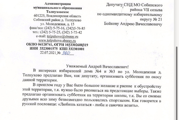 В редакцию вновь обратился депутат Андрей Бойков, предоставив очередную переписку с чиновницей. Он обратился к главе поселения 13 июля с просьбой покосить муниципальную территорию в деревне Толпухово. Здесь находится спортплощадка, построенная на средства предпринимателей. Поселение хотело взять ее на баланс. Тем более что именно на этой площадке занимаются ребята из спортивной секции.