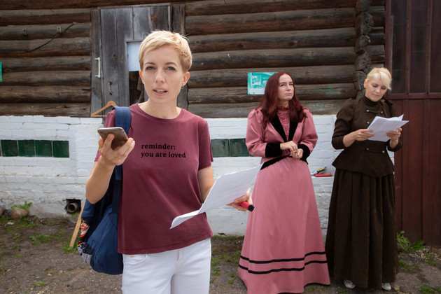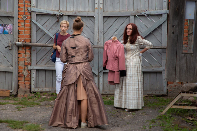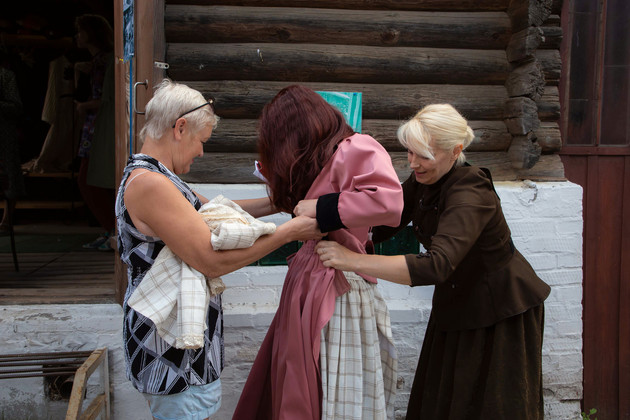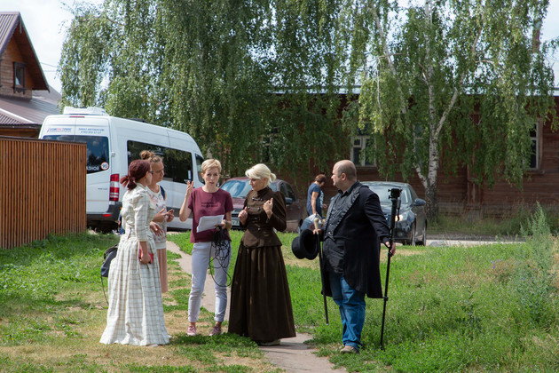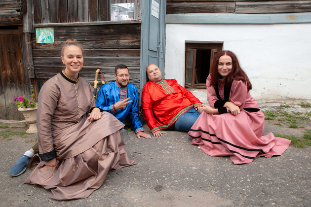 Туда-то мы первым делом и отправились — для съемок нашего видео, после того, как режиссер, автор сценария будущего ролика по мотивам «Женитьбы...», шеф-редактор ВГТРК Дарья Мищенко и наш оператор, фотокорреспондент «ВВ» Наталья Ларина распределили роли по эпизодам. В итоге маменькой Бальзаминова стала пресс-секретарь Владимирского филиала той самой компании Алла Плотникова, Раисой и Домной Евстигнеевной — собственный корреспондент ТАСС по Владимирской и Рязанской областям Анна Устинова, Анфисой и свахой — я, редактор редакционного отдела «ВВ» Марина Киселева, одним из братьев Анфисы и Раисы плюс закадровым голосом — корреспондент ВГТРК Александр Сыпченко, а вторым братом скучающих сестричек и, конечно, самым главным героем — главред вязниковской газеты «Маяк» Никита Ефимов. Кстати, как он танцевал антраша и целовал Домне ручки— это надо видеть!