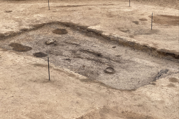 Покоится всадник в нетипично большой (во всяком случае, по меркам соседних захоронений) могиле - 3,3 на 1,6 метра. Останков боевого коня не обнаружено, но о том, что это именно всадник говорят стремена, удила, подпружная пряжка. Мужчина лежал на деревянном настиле. Впрочем, может быть, конструкция была и посложнее - за столько столетий время ее не пощадило.