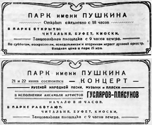 В июле 1944 года, несмотря на войну, местная газета продолжала критиковать администрацию парка… за танцы: «Смена кончила работу. Молодежь вышла из ворот завода. Впереди — свободный вечер. Чем его заполнить? Драмтеатр закрыт, картина в кино уже просмотрена. Остается клуб и городской парк — но там, кроме танцев, ничего нет. Да и опять-таки не каждый юноша и девушка могут попасть на танцы: билеты стоят 10 рублей».