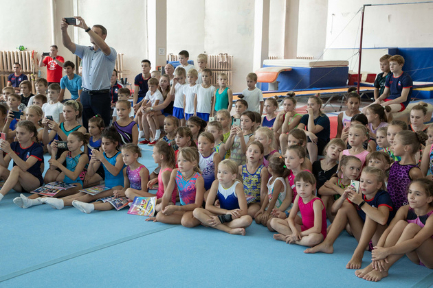 Ангелину громко приветствовали юные гимнасты, выкрикивая поздравления. Это было до мурашек по спине! Все дети заранее собрались в огромном спортивном зале и показали гостям лучшие свои упражнения. Большинство мечтали увидеть олимпийскую чемпионку. Самым удачливым удалось потрогать ее золотую медаль, которую спортсменка привезла с собой.