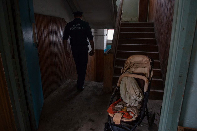 В сопровождении сотрудника МЧС мы с Татьяной поднимаемся в ее комнату, которую она так удачно приобрела и так внезапно потеряла в один несчастный день. На входе на этаж нас встречает брошенная детская коляска. На веревке в коридоре висит белье, рядом – детские качельки. Через снятые двери видно то, что осталось от прошлой жизни жильцов дома. В одних комнатах - разгром и ужас. То ли результат пожара и тушения, то ли люди уже вывезли, что смогли, бросив ставшее непригодным. В других - такой вид, будто жильцы ненадолго отлучились. Люди жили, радовались, ругались, строили планы. И вдруг из-за одной не потушенной сигареты все эти планы поломаны...