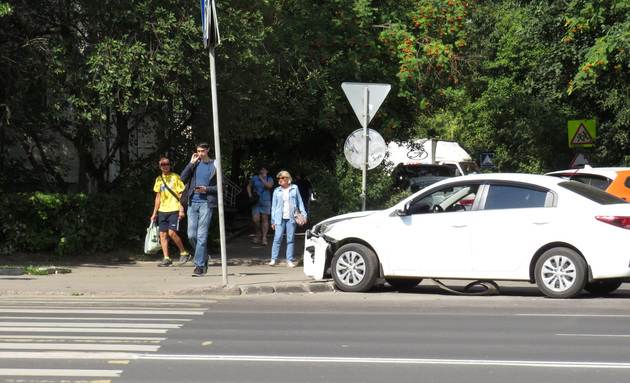 В результате ДТП автомобиль “Киа Рио” выбросило на тротуар, однако достаточно высокий бордюр удержал легковушку в нескольких сантиметрах от стоявших на тротуаре пешеходов. Отлетевший при этом кусок бордюра, к счастью, никого не задел.