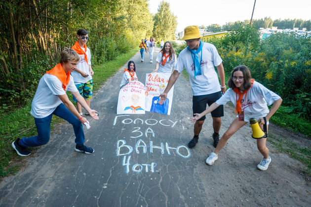 Когда парад завершён, отряды готовятся к агитации. Тут любые средства хороши. Кто-то пишет объявления с просьбой проголосовать и цепляет к ним вкусные конфеты. Кто-то рисует на асфальте мелками огромный лозунг – такой точно не упустишь из виду. Мы тоже стали «жертвами» агитации от отряда того самого Ивана «без шуток». Ребята с рупором и плакатами ходили по лагерю и останавливали каждого встречного, чтобы задать ему вопросы. Агитировали ребята безапелляционно.
